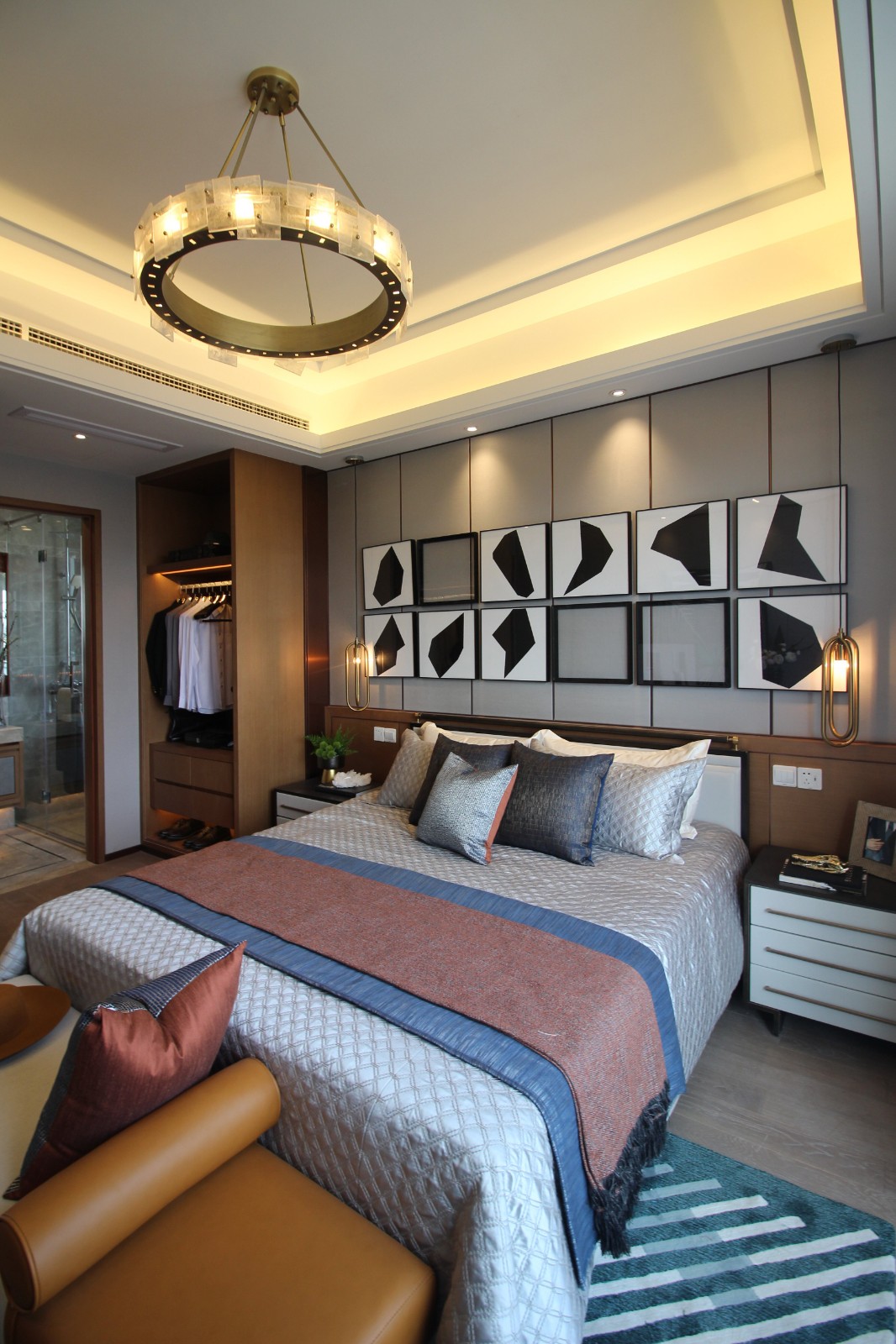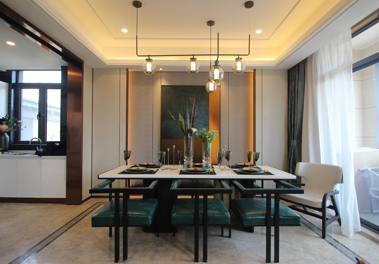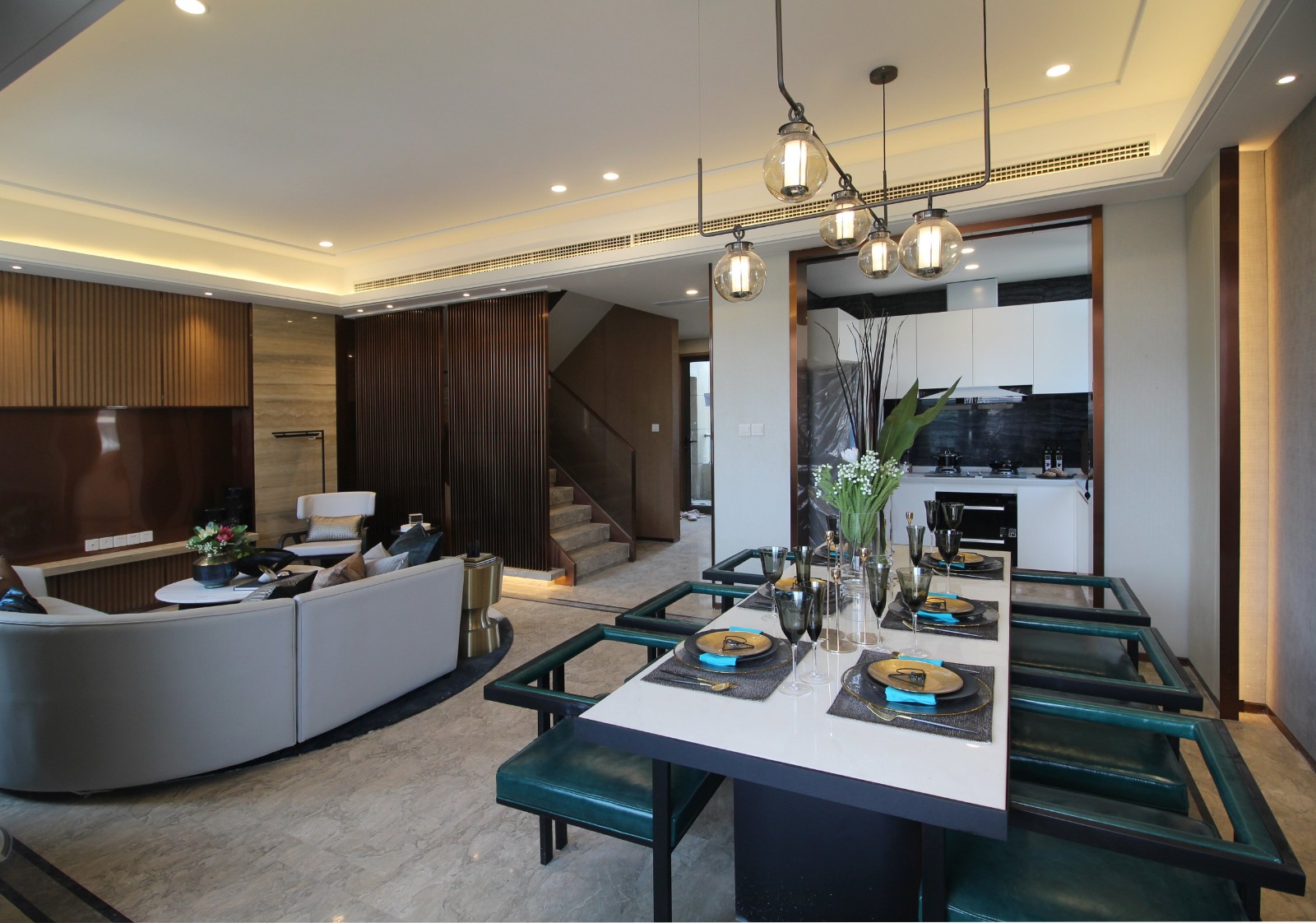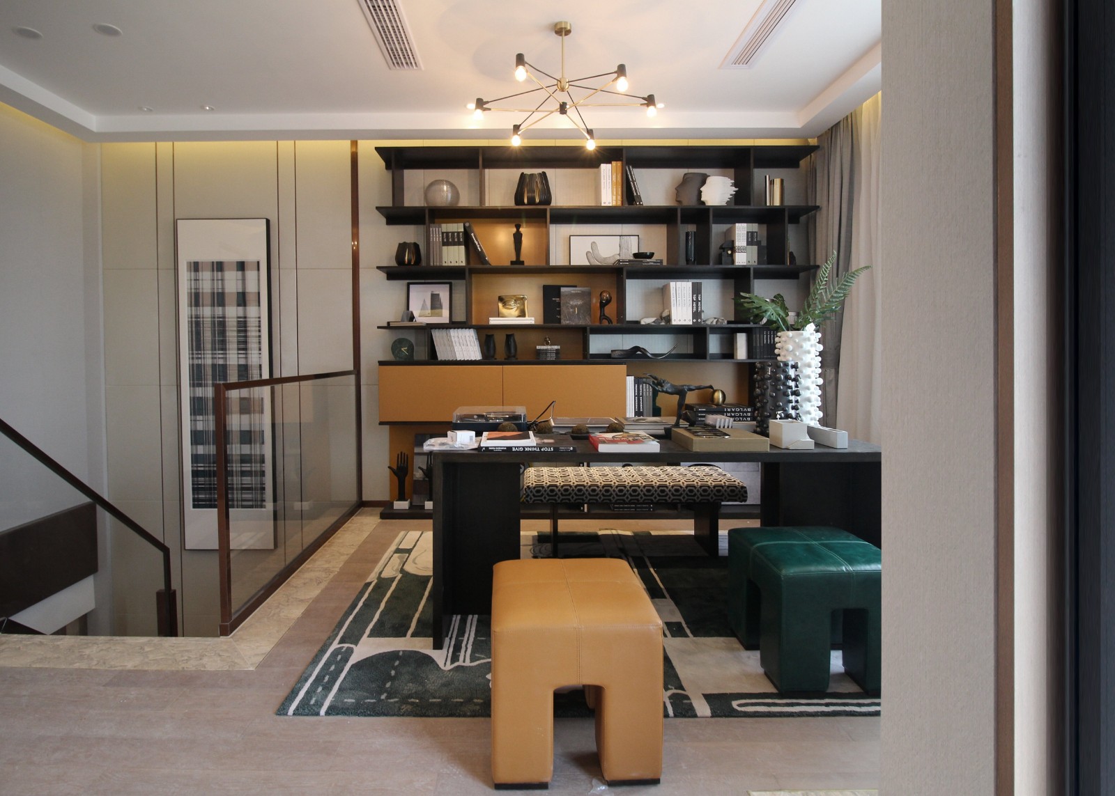 一層承載了家庭起居的基本功能,在從門廳進入客廳的縱向性布局基礎上,以地毯線條和吊燈裝置陣列分布相呼應,從視覺上,形成了客餐廳的延伸感。餐廳中加入藝術家的作品,提升整個空間的藝術性和當下時代精神。客餐廳保持傳統的陳設布局方式,飾品的擺放相對規整,看似穩定的布局,卻有著空間的自由度和個性。