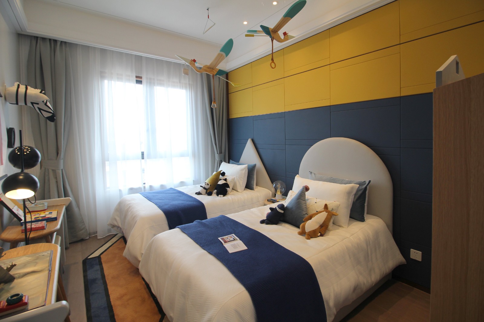 男孩房承載了對世界的好奇,吊燈采用飛舞的蜻蜓為概念,色彩的變化總是超出預期,似乎沒有規律又充滿節奏,雙子的家具布局更加靈活多變,強烈的色彩對比跳脫卻暗合空間主人的個性。