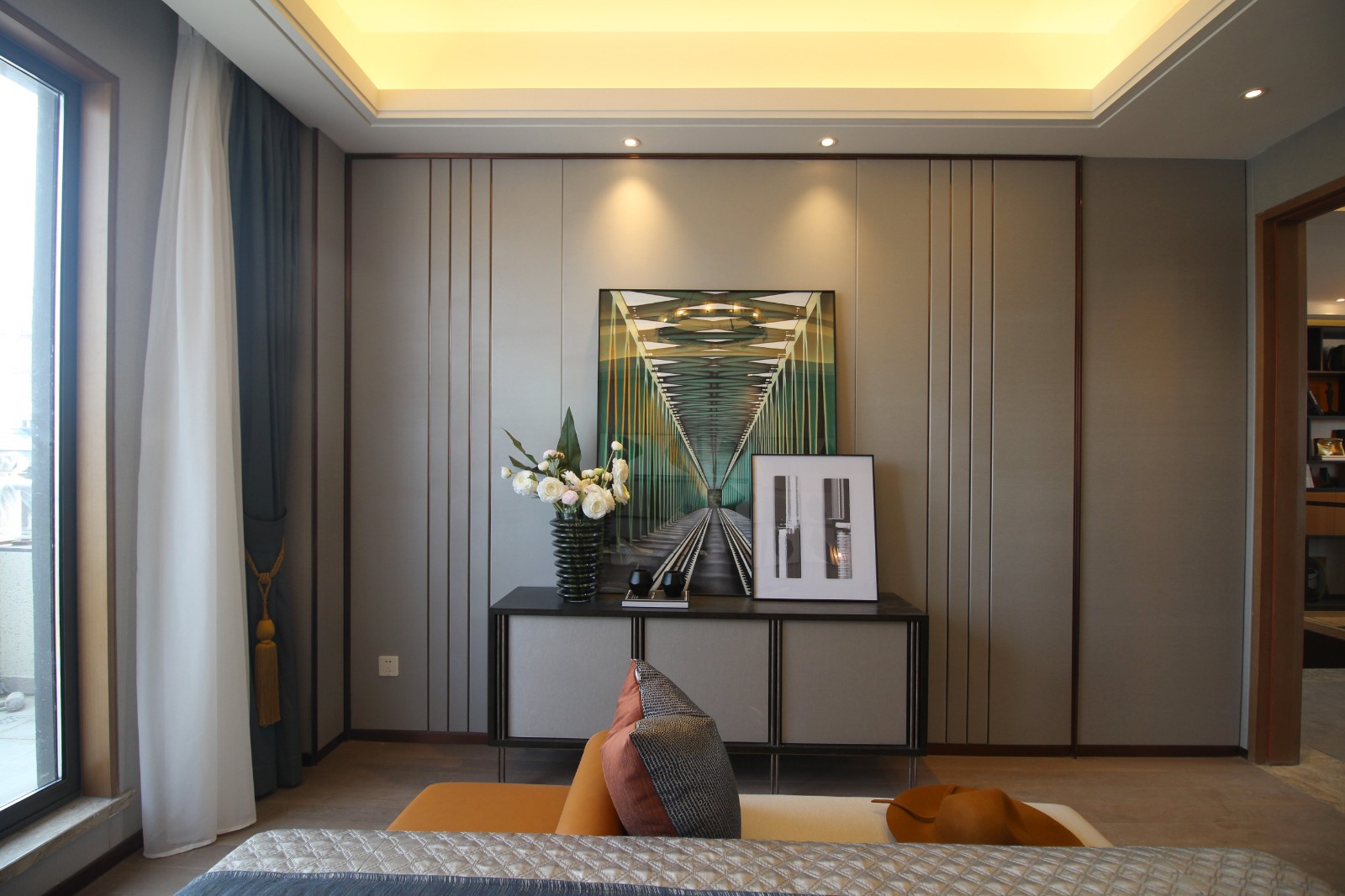 二層將建筑最好的陽光和庭院景色留給了長輩居住的空間。長輩房色調平穩舒適,以棉麻、木紋材質構成了空間的主要氣質。